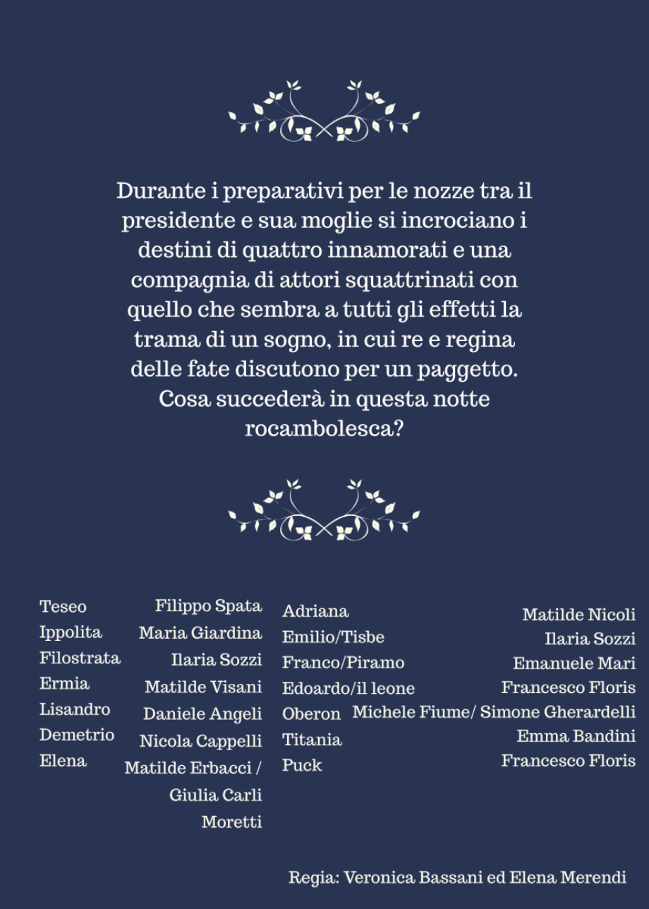 Durante i preparativi per le nozze tra il presidente e sua moglie si incrociano i destini di quattro innamorati e una compagnia di attori squattrinati con quello che sembra a tutti gli effetti la trama di un sogno, in cui re e regina delle fate discutono per un paggetto. Cosa succederà in questa notte rocambolesca? Regia: Veronica Bassani ed Elena Merendi