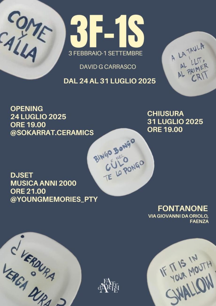 Un’esplosione di provocazione, ironia e ceramica: David G Carrasco arriva a Faenza con 3F–1S, una mostra che intreccia cultura popolare, espressioni dialettali e riflessioni sulla comunicazione. Piatto dopo piatto, l’artista ci guida attraverso un’estetica spiazzante e audace, dove il confine tra arte e umorismo si assottiglia fino a scomparire.